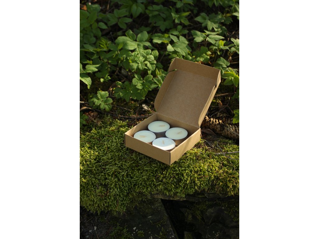 Čajová svíčka s vůní jehličí – intenzivní kombinace jedle a cedru. Přineste si domů čerstvou lesní atmosféru.